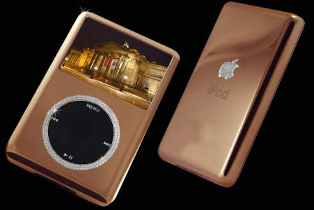 The iPod Supreme Rose edition by Stuart Hughes is an Apple iPod covered with 263 grams of 18k rose gold, creating a copper-like shade. The platinum navigation is studded with 4.5 carats of flawless diamonds. The platinum rear Apple logo plays host to an additional fifty three diamonds. Even the navigation wheel has 4.5 carats of diamonds. This is a limited edition design, consisting of only 10 units available worldwide.