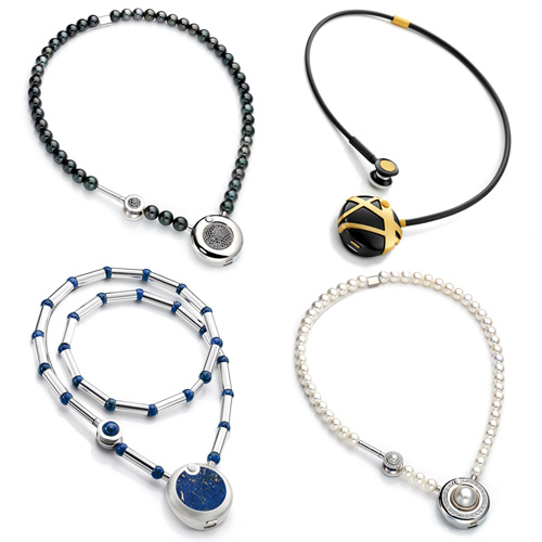 Three of the styles are for women. The Victoria Lapis features a blue stone dusted with gold pyrite, The Victoria Pearl necklace is handmade gold, while Victoria Stripes uses black silicone with brushed gold. The Victoria Wave sports a white and blue pendant and is for men. The Victor features a pendant that travels around the neck and clips onto a shirt or jacket. The price? $120,000.