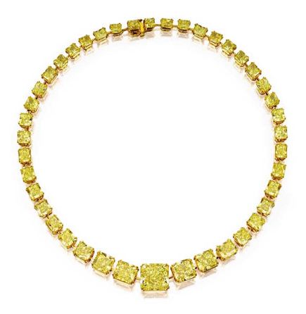 The top price was achieved by a fancy vivid yellow diamond necklace, which soared to $3,554,500. The matching 42 GIA Fancy Vivid Yellow Diamonds from a private collection totaled 100.17 carats. It is is believed to be the first necklace set entirely with fancy vivid yellow diamonds ever to have appeared at auction. It was purchased by a Chinese collector.