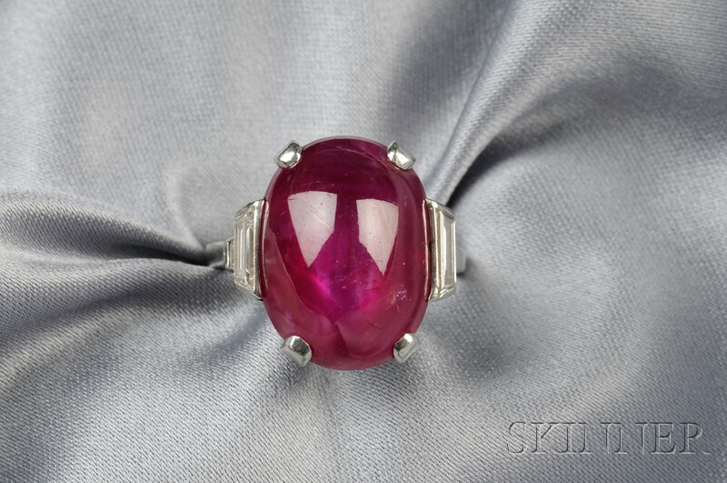A rare star Burma ruby and diamond ring smashed the auction pre-sale estimate of $15,000 to $20,000. Whomever put this low estimate doesn't know Burma star prices. The 28 carat oval cabochon star ruby was extraordinary in size and color, and brought $242,500. It was accompanied by an AGL report stating the ruby is natural, Burma origin: