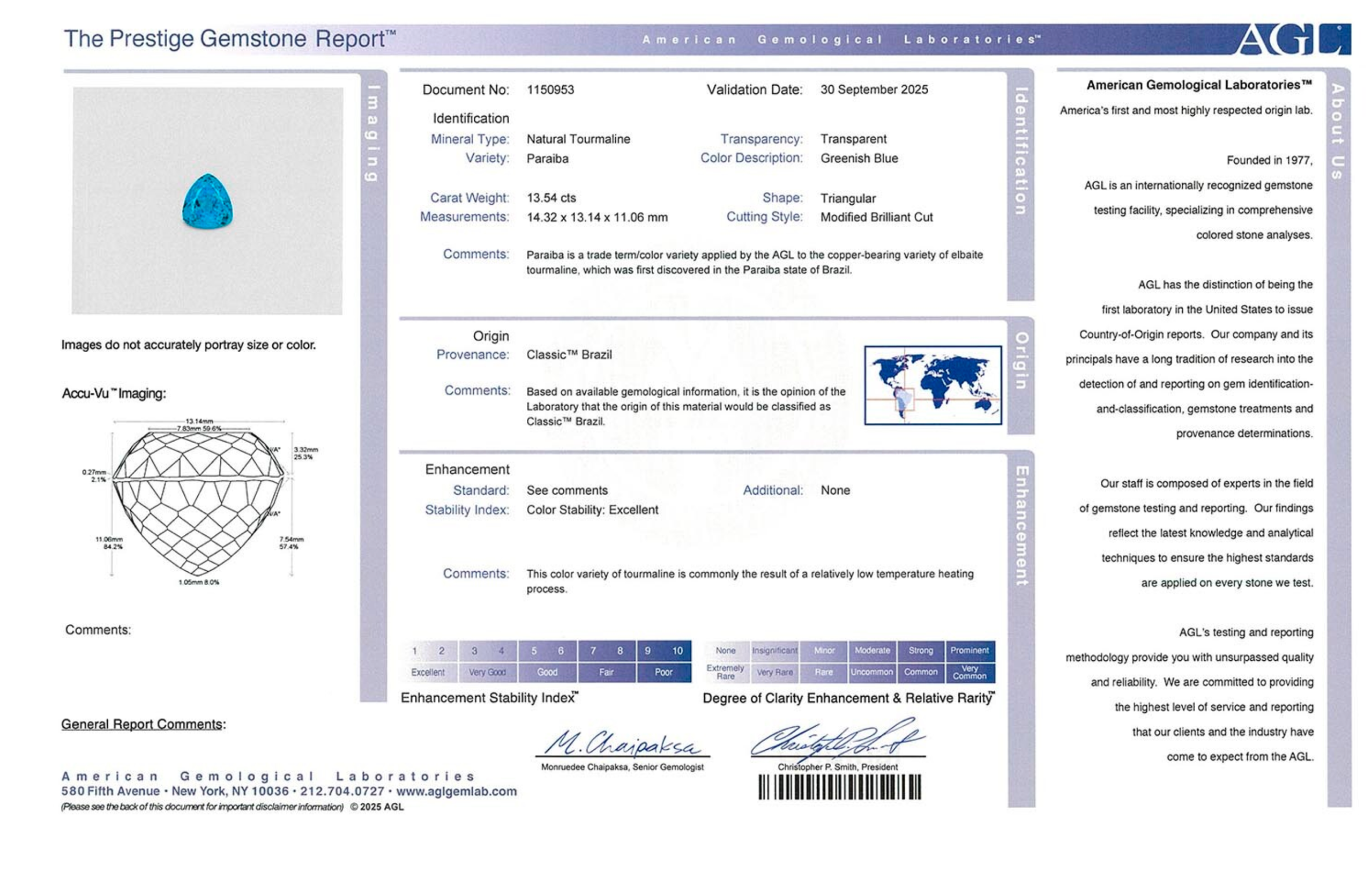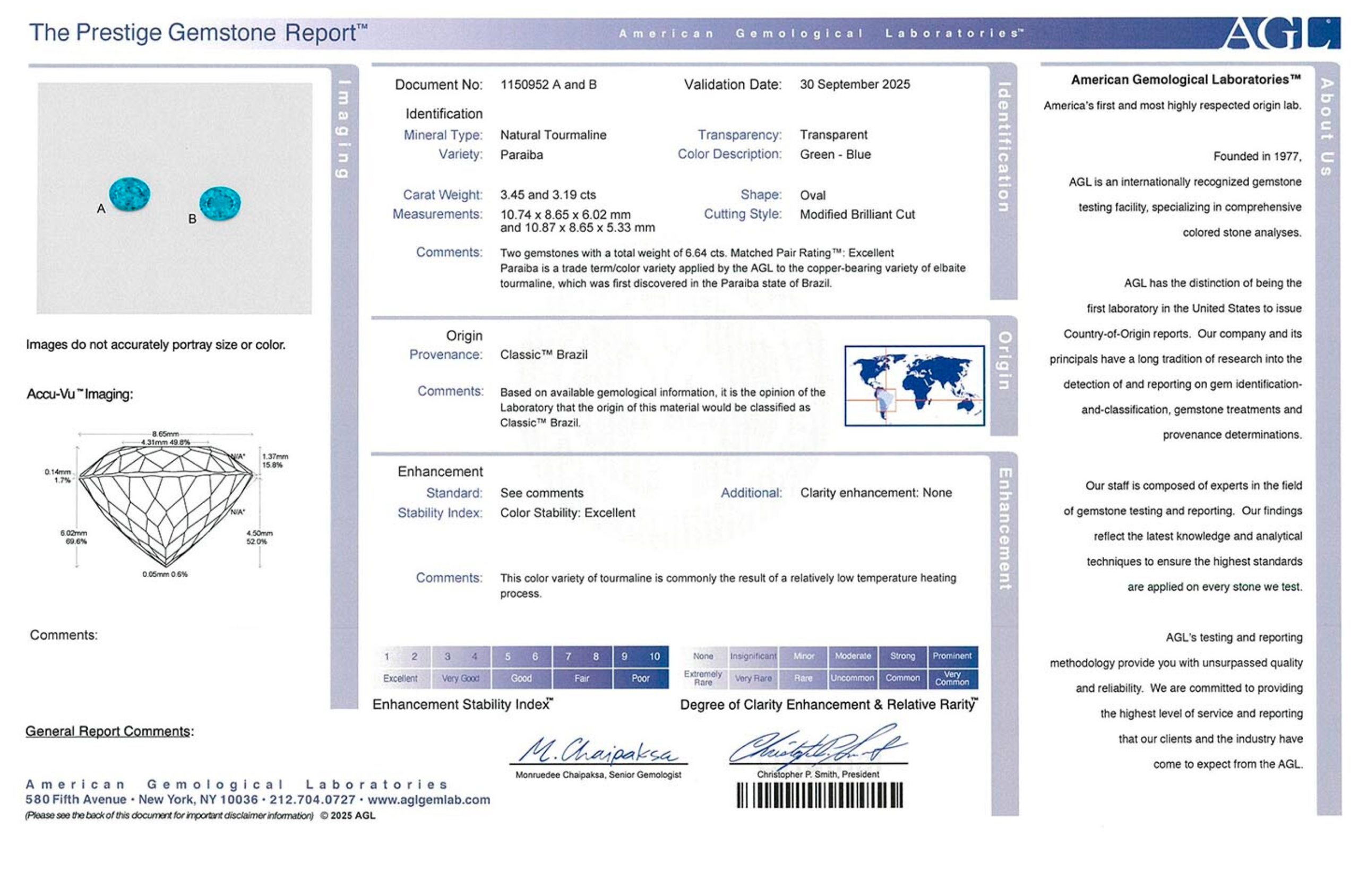 The AGL reports noted a green-blue color balance (roughly 50/50, akin to colored diamond grading), with the same desirable low-heat treatment for stability. These stones hail from the original Brazilian deposits, prized by collectors for decades.