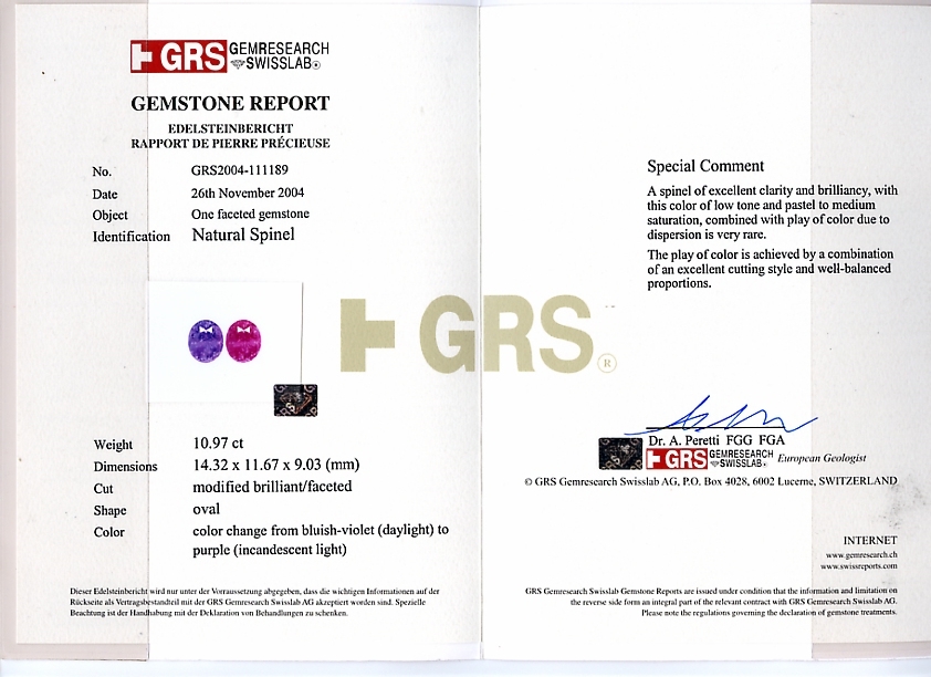 One of the largest color change spinels on the market. The blue is similar to a light blue sapphire and the purple is similar to an amethyst. This stone is ultra-rare. The majority of the value of any color change stone is the color change. According to AGL, color change is strong and the quality of the change is excellent. No need to use your imagination with this stone, the color change is obvious. Further, the color tone is 3/75. This means the stone is top color and perfect tone. The colors are vivid and the stone never "black-out." The clarity is MI1, so you can see some inclusions in the rock. The proportions and finish are extremely high at Excellent to Very Good. You rarely see these numbers from a stone from Asia. The depth is 78% and the brilliancy is 100%, or the same as a round diamond! Finally, the stone has the coveted excellent TQIR. Lastly, the stone has no clarity treatment or enhancement. The gem has also been graded by GRS. It contains the special comment, "A spinel of excellent clarity and brilliancy, with this color of low tone and pastel to medium saturation, combined with play of color due to dispersion is very rare. The play of color is achieved by a combination of an excellent cutting style and well-balanced proportions." See this comment in the link below. A 25.79 color change spinel recently sold for almost $9000 per carat at auction in Hong Kong, December, 2015. A fascinating gemstone to collect or a statement piece to mount in jewelry.